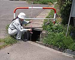 ブロック塀や電柱、既存の境界標を測量して、現地に存在する地物を測ります。